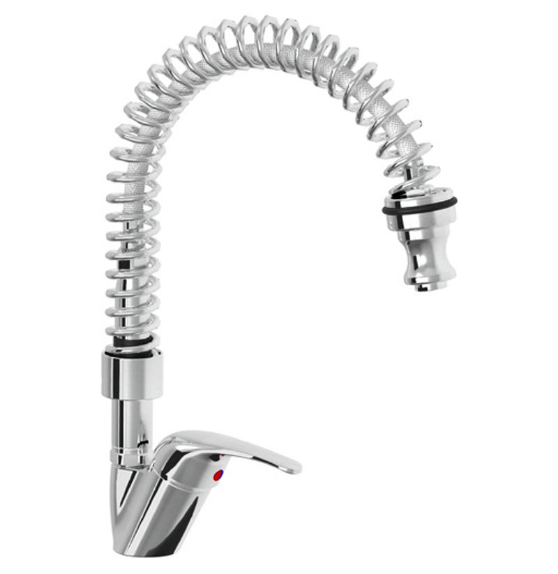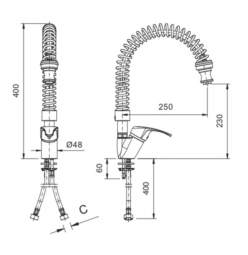 Model stolní s pákovým ovládáním, tlakovou hadicí a vyvažovací pružinou. Model je v robustním provedení s odolnou kartuší CX42, včetně přívodních hadic 3/8"(d=400 mm).