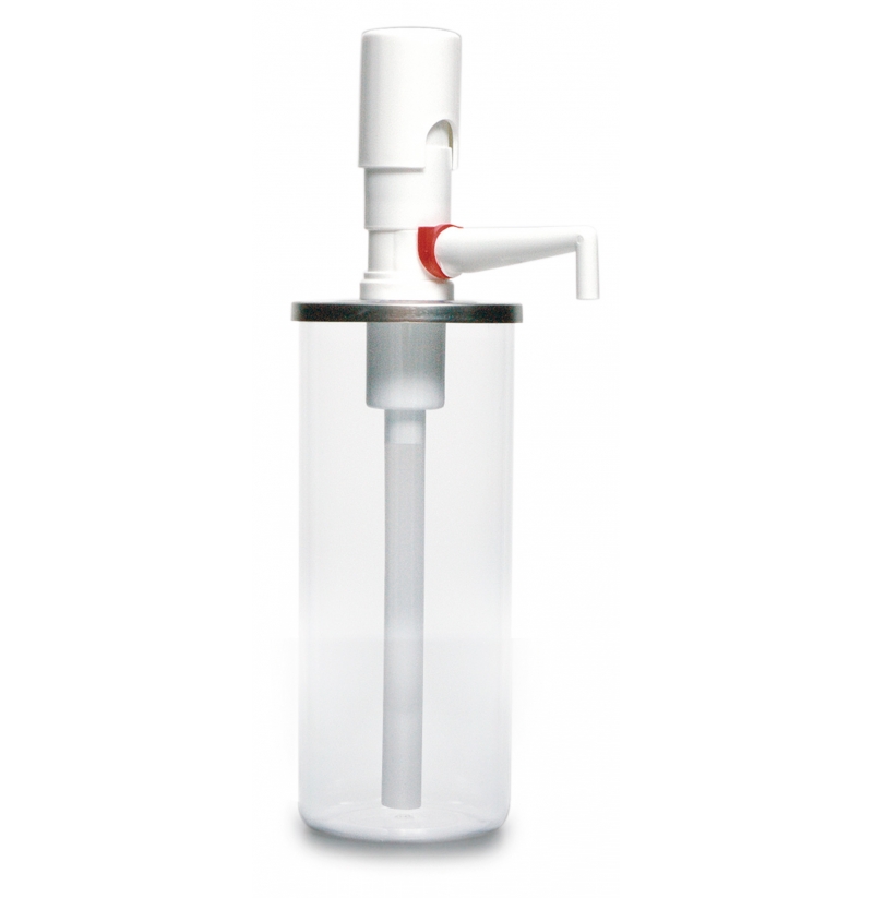 SklademRuční plastový dávkovač GKC-R-BKA-095. Plastová čirá nádoba obsahu 950 ml. Nastavitelné dávkování 12,5 a 25 ml. Barva dávkovače bílá. DOPRODEJ posledních 4 ks !