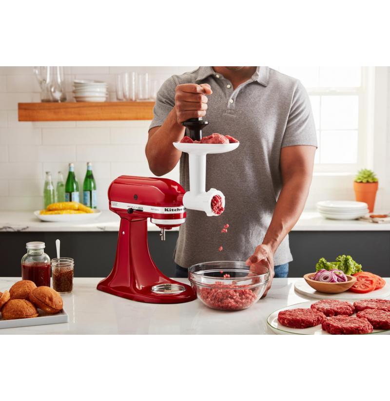 Přídavný mlýnek na potraviny 5KSMFGA. Vytvořte si z ingrediencí zdravé a čerstvé pokrmy, které si připravíte sami a navíc máte jistotu, že vše je čerstvé a ideálně namleté dle vašich představ. Mlýnek na maso 5KSMFGA s nástavci snadno a rychle zpracuje suroviny, pomůže s přípravou burgerů, paštik, salsy, pomele tvrdé sýry, pečivo a dětem připraví zdravou přesnídávku. Se snadným zatlačení jakéhokoli druhu potraviny směrem k noži pomůže pěchovač. Mlýnek je kompatibilní se všemi modely kuchyňských robotů KitchenAid.