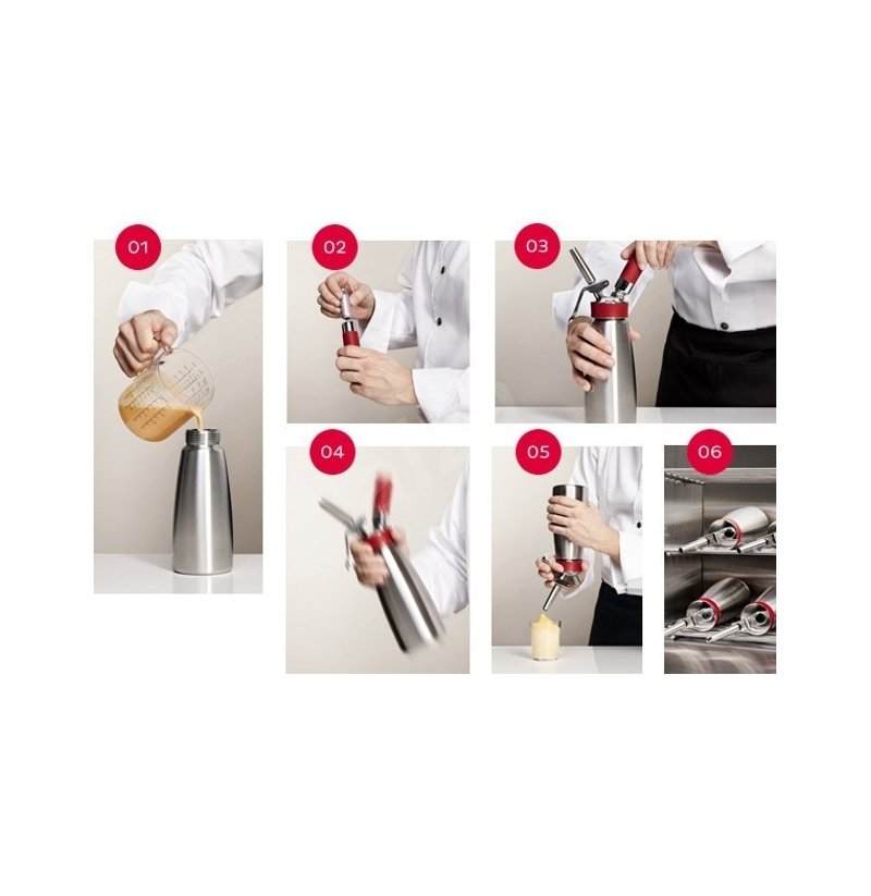 Pro přípravu nadýchaných pěn, teplých a studených omáček, vyšlehaných krémových polévek, šlehačky a dezertů. Lahev iSi Gourmet Whip PLUS je možné zahřívat, popř. udržovat při konstantní teplotě ve vodní lázni při teplotě max 75°C. Na 1 litr láhve je potřeba použít 2 jednorázové bombičky. Bombičky nelze opakovaně plnit.